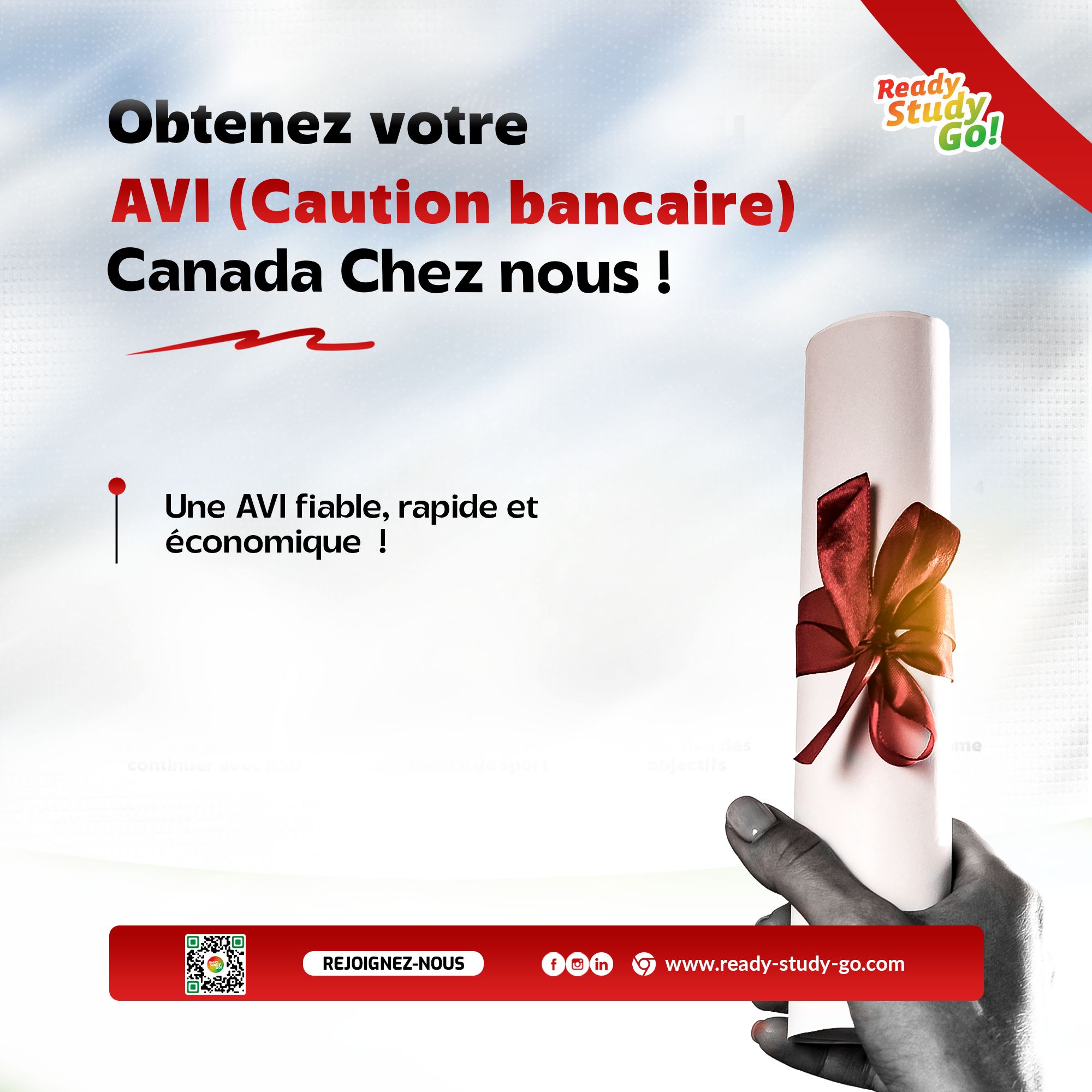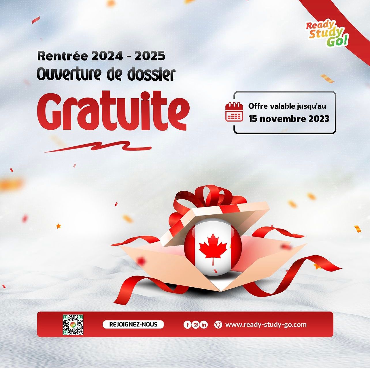 Ready Study Go étant le canal par excellence pour s'assurer un suivi optimal pour ses formalités pour ses études au Canada, il vous suffit de nous contacter au 70694172 ou au 70694171 pour ouvrir votre dossier (gratuitement jusqu'au 15 novembre) et commencer les formalités pour le succès de votre mobilité.