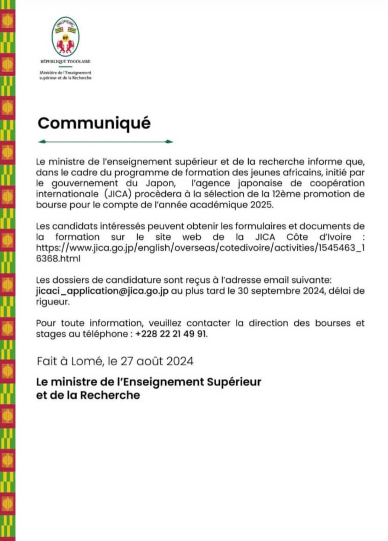 Le ministère de l'enseignement supérieur togolais et de la recherche informe que les candidats intéressés peuvent obtenir les formulaires de documents de la formation sur le site web de la JICA Côte d'ivoire