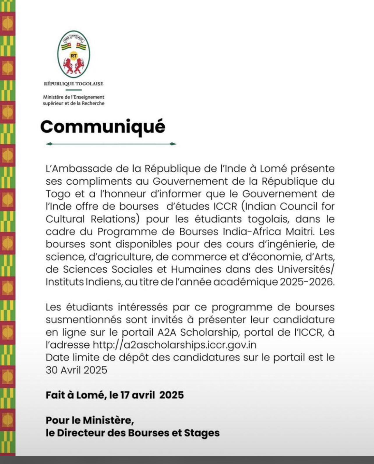 En collaboration avec l'embassade de l'INDE à Lomé, un programme de bourse pour les cours d'ingénierie, de science, d'agriculture, de commerce et d'économie, d'Arts, de Sciences sociales et Humaines des universités indiennes pour 2025/2026 est disponible