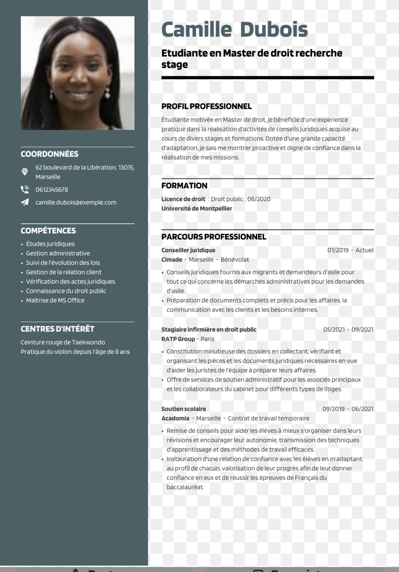 - Les essentiels; Nom, prénoms, âge, adresse, contact ( mail et numéro) - Photo réglementaire ( photo passeport) non obligatoire, mais cela peut humaniser votre CV. Évitez les photos avec les filtres Snapchat, les photos trop suggestives ou avec des mimiques, ou des photos dans des tenues peu professionnelles. Vous pouvez aussi créer une rubrique pour parler de vous en quelques phrases en dessous de votre photo ou de votre nom ( cf exemple de CV en image dans l’article). N’oubliez pas qu’il ne faut pas surcharger le CV. Attention: il faut éviter qu'à première vue votre CV ressemble à un livre c'est-à-dire qu'on y voit seulement des phrases alignées formant des blocs. Il faudra faire preuve d'ingéniosité en créant des tableaux par exemple pour aérer et épurer le document, ou utiliser les outils de Word comme des puces, mettre des choses importantes en gras etc. L'essentiel est vraiment d'aérer le document en le structurant.